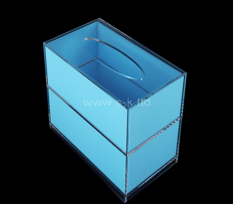 Maßgefertigte 2-lagige Tissuebox aus Acryl mit Schublade, mit transparentem Korpus und durchscheinenden blauen Akzenten. Die obere Schicht bietet Platz für Taschentücher, während die untere Schublade kleine Utensilien aufnimmt. Langlebig, leicht zu reinigen und perfekt für Badezimmer, Schlafzimmer, Büros oder moderne Arbeitsplatten.