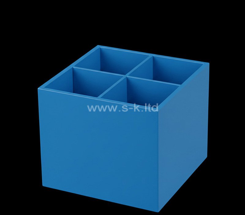 Individuell gestaltete blaue Acrylbox mit 4 Fächern für Make-up-Pinsel zur ordentlichen und stilvollen Aufbewahrung von Kosmetika. Die unterteilten Fächer halten Pinsel, Eyeliner, Lippenstifte und Beauty-Tools organisiert und leicht zugänglich. Aus langlebigem, hochwertigem Acryl gefertigt, ist er robust, leicht zu reinigen und perfekt für Schminktische, Schminkstudios und professionelle Kosmetiktheken.