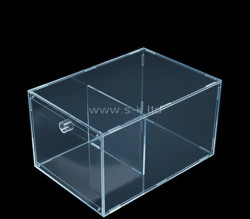 Maßgefertigte, durchscheinende blaue Acryl-Vitrine mit integrierter Trennwand für eine übersichtliche Präsentation. Das halbtransparente Design verbessert die Sichtbarkeit der Produkte und trennt die Artikel gleichzeitig sauber voneinander. Langlebig, stilvoll und individuell anpassbar – ideal für Verkaufsdisplays, Sammlerstücke, Kosmetika, Accessoires oder Werbepräsentationen.