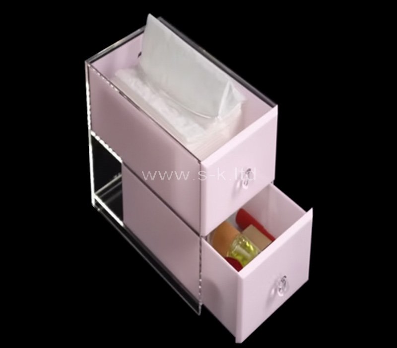Maßgefertigte, klare und rosa Acryl-Tissuebox mit integrierter Aufbewahrungsschublade, die Stil und Funktionalität vereint. Der transparente Körper unterstreicht den modernen Look, während die glatte Schublade kleine Gegenstände ordentlich aufbewahrt. Langlebig, leicht zu reinigen und ideal für Badezimmer, Schlafzimmer, Büros oder Waschtische.