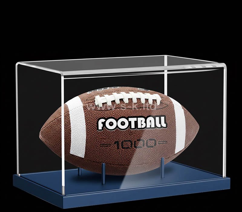 Caja expositora personalizada de acrílico para recuerdos futbolísticos con una base azul brillante, perfecta para exhibir y proteger tus balones de fútbol coleccionables. Fabricada en acrílico transparente de alta calidad, ofrece una visibilidad total al tiempo que mantiene tus preciados objetos libres de polvo y elegantemente expuestos.