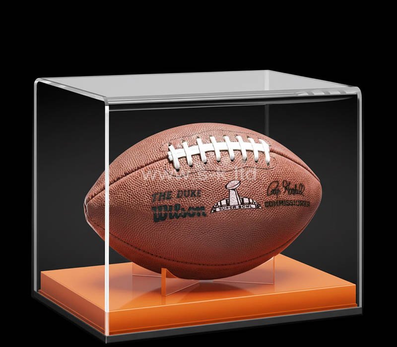 Vitrina personalizada de acrílico para recuerdos futbolísticos con una llamativa base naranja, diseñada para proteger y exhibir tus balones de fútbol coleccionables. Fabricada en acrílico transparente y resistente, garantiza una visibilidad total al tiempo que mantiene tus preciados objetos libres de polvo y elegantemente presentados.