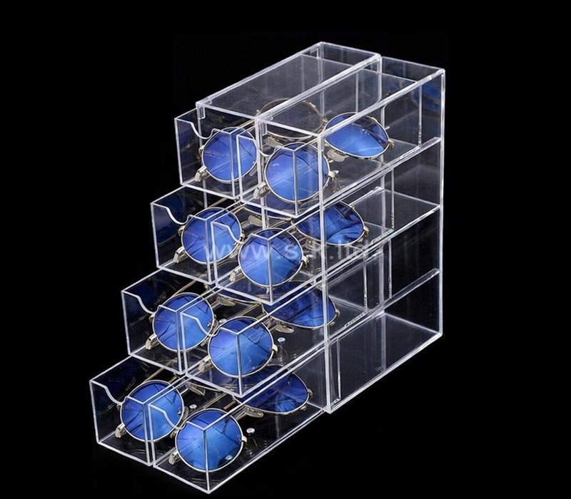 Caja expositora acrílica personalizada con cajones para gafas de sol, fabricada en acrílico transparente de primera calidad para ofrecer un aspecto elegante y moderno. Cuenta con varios cajones extraíbles para un almacenamiento organizado y de fácil acceso, perfecto para colecciones personales o de venta al por menor. Totalmente personalizable en tamaño, color y marca.