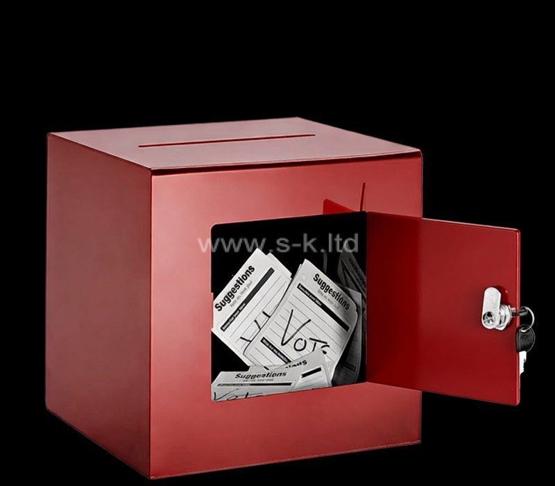 Boîte à suggestions en acrylique rouge personnalisée, conçue pour recueillir en toute sécurité les bulletins de vote ou les commentaires. Fabriquée en acrylique transparent et durable, elle est visible et résistante aux manipulations. Idéale pour les élections, les enquêtes ou les campagnes de suggestions, avec des options de personnalisation pour les logos et la marque.