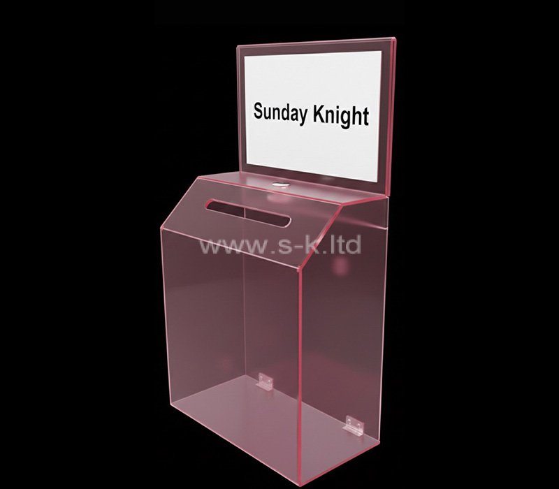Boîte de collecte de bulletins de vote en acrylique translucide violet avec porte-affiche, conçue pour les bureaux, les écoles et les événements publics. Fabriquée en acrylique de première qualité, avec des bords lisses et polis et une construction robuste. Idéale pour recueillir les bulletins de vote en toute sécurité tout en affichant clairement les instructions de vote ou les avis.