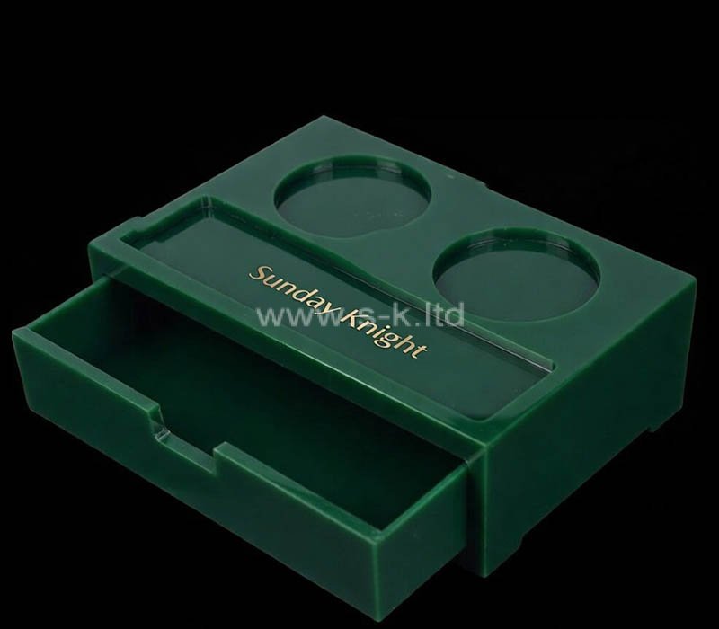 Plateau de service pour tasses d'hôtel en acrylique vert personnalisé avec tiroir intégré, conçu pour une organisation élégante de la chambre d'hôtes. Fabriqué en acrylique durable et de haute qualité, il accueille proprement les tasses, les sachets et les accessoires, tandis que le tiroir coulissant permet de ranger les sachets de thé ou les fournitures de café. Élégant, facile à nettoyer, il est idéal pour les hôtels modernes.