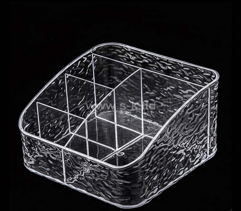 L'organisateur de soins et de maquillage en acrylique avec plusieurs compartiments est doté d'une surface texturée unique avec d'élégants motifs de vagues. Conçu avec de multiples compartiments pour les flacons de soins, le maquillage, les pinceaux et les outils. L'acrylique durable de première qualité offre une visibilité claire, une esthétique moderne et un rangement organisé pour les vanités, les comptoirs et les présentoirs de vente au détail de produits de beauté.