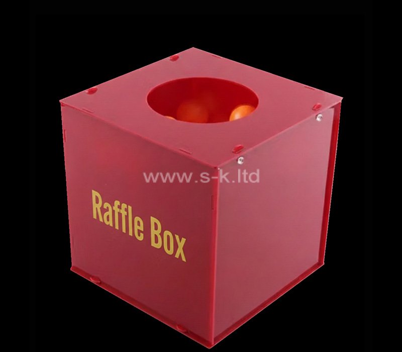 Boîte de tirage de prix en acrylique rouge personnalisée, conçue pour les événements, les expositions et les campagnes promotionnelles. Fabriquée en acrylique de haute qualité, avec des bords lisses et polis et une construction robuste. L'ouverture par le haut facilite l'entrée, ce qui est idéal pour collecter des billets de tombola, des cartes de tirage au sort ou des participations à des concours.