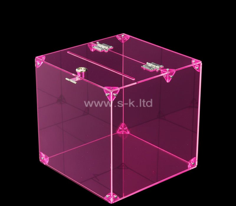 La boîte de collecte de votes carrée en acrylique translucide est idéale pour les élections, les suggestions, les collectes de fonds et les bulletins de vote pour les événements. Fabriquée en acrylique transparent robuste avec une teinte violette vibrante, elle est dotée d'une fente sécurisée et d'un couvercle verrouillable. La taille, l'impression du logo et le design peuvent être entièrement personnalisés.