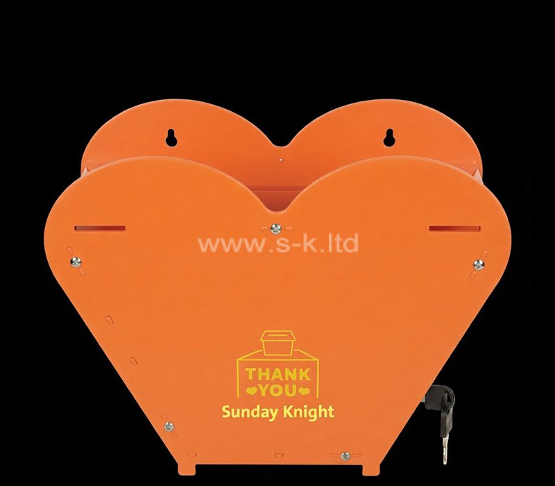 Tirelire murale en acrylique orange personnalisée en forme de cœur, conçue pour la collecte sécurisée de pièces ou de dons. Fabriquée en acrylique transparent et durable, elle apporte une touche vibrante et accrocheuse. Idéale pour les événements caritatifs, les collectes de fonds ou les espaces publics, avec des options de personnalisation pour les logos et les messages.