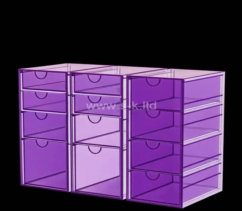 Organizer multi-cassetto personalizzato in acrilico traslucido viola, realizzato per riporre in modo elegante ed efficiente prodotti per la cura della pelle, trucchi e oggetti di uso quotidiano. Il suo design vivace e resistente aggiunge colore e chiarezza a qualsiasi mobile da bagno o espositore. Consegna in tutto il mondo inclusa: la spedizione copre tutto, dalle tasse e dai dazi doganali al sorriso finale alla tua porta.