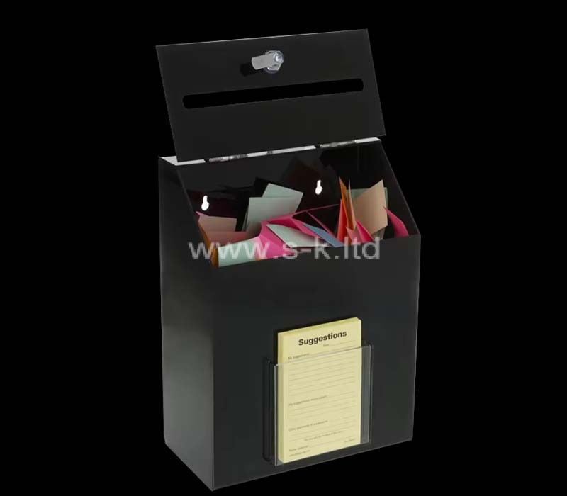 A custom wholesale black acrylic suggestion box with brochure holder combines functionality and style for gathering feedback. Its sleek design includes a brochure holder for additional information, making it ideal for offices, businesses, and customer service areas.
