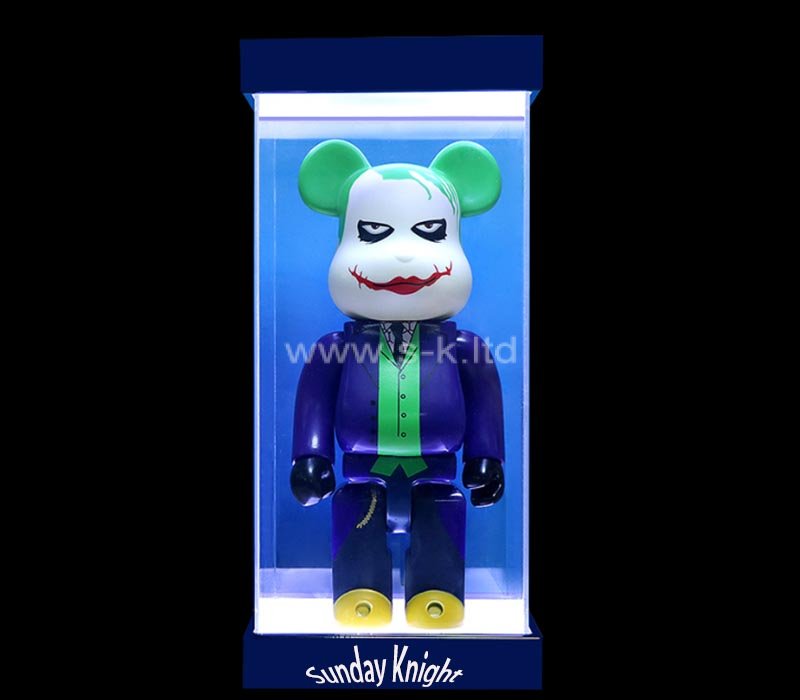 Wholesale custom acrylic figure toy LED display boxes with blue top and base are available. These boxes are made from durable clear acrylic and feature a blue top and base for a stylish presentation. Integrated LED lighting enhances the visibility and appeal of the figures. Customization options include size, color, and design to meet specific needs. These boxes are ideal for retail displays or personal collections.