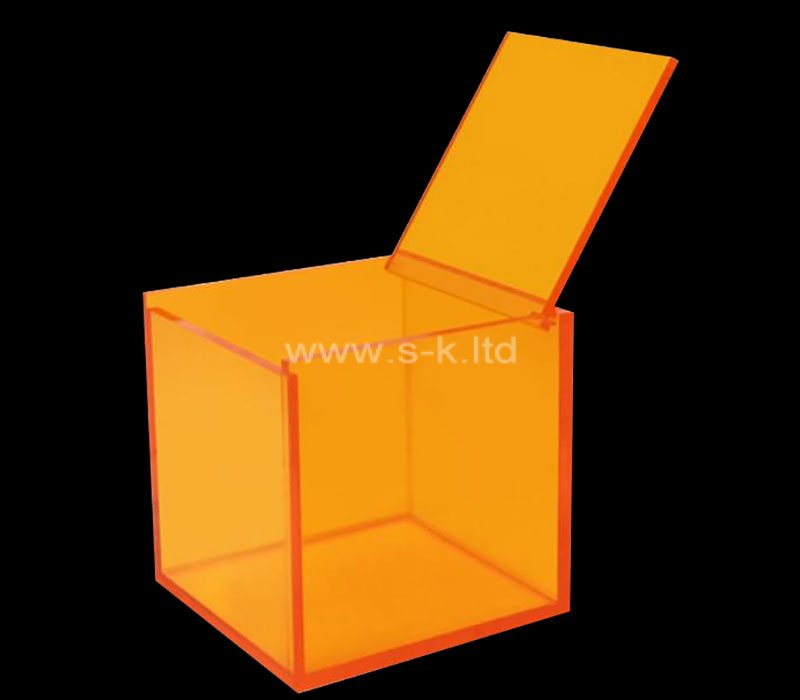 Presenting our wholesale custom lucite translucent orange square hinged lid box, combining flair and function. Its durable, vibrant design with hinged lid offers chic storage for desks, shelves, or workspaces.